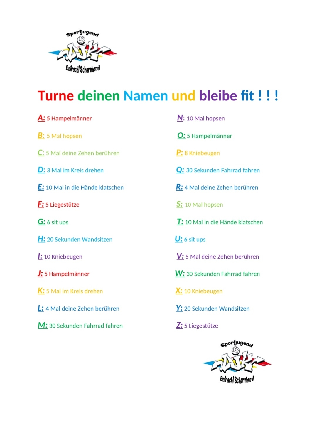 Hier kommt gleich eine neue Bewegungsidee für euch: wir haben uns ganz viele Aktionen zu jedem Buchstaben des Alphabets ausgedacht. Ihr könnt jetzt - egal ob groß oder klein - euren Namen turnen. Wer es ganz spannend machen möchte, kann sich ein Wort ausdenken, es turnen und die anderen müssen erraten, welches Wort es ist.