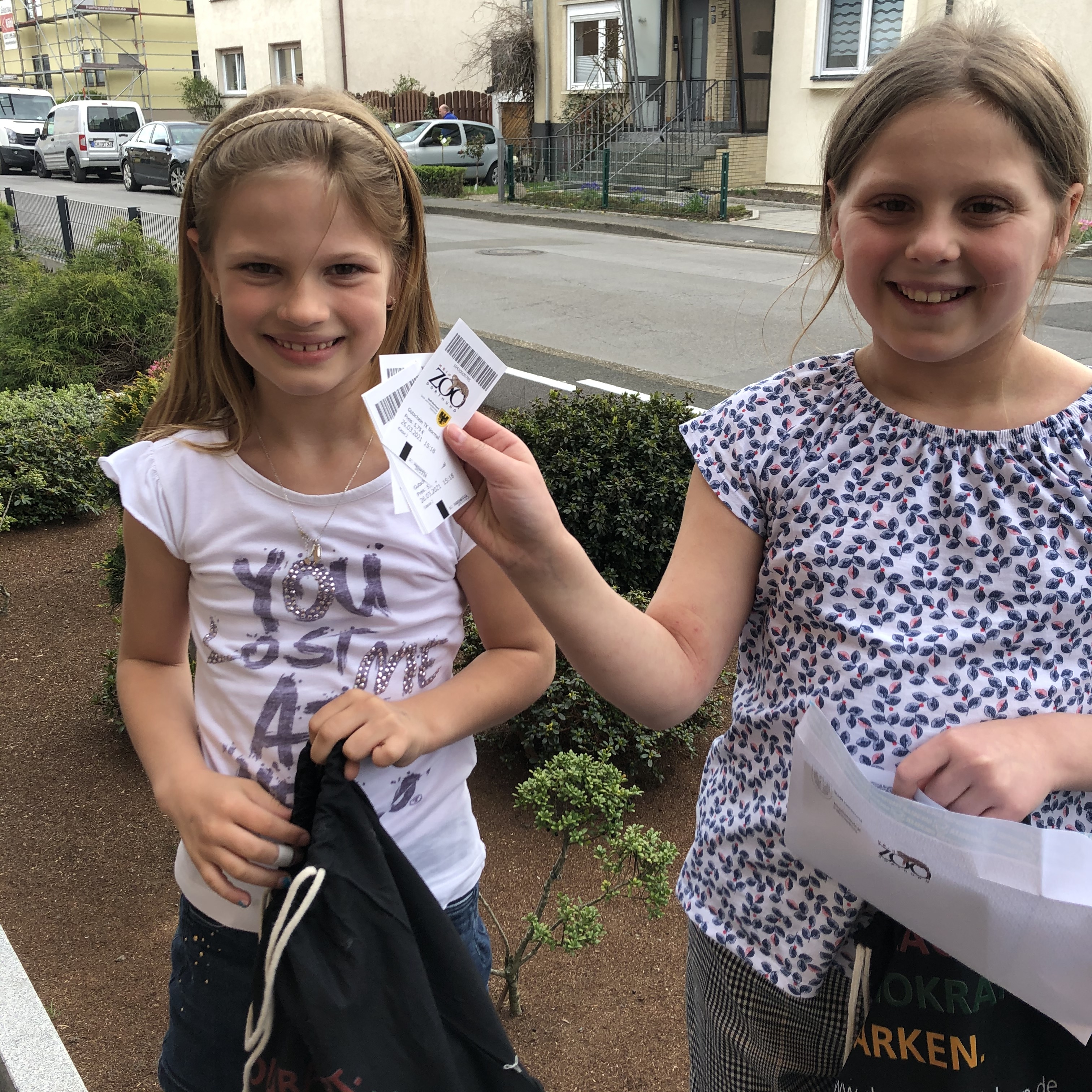 Emily( 11) und Maya (7) hatten viel Spaß bei der DJK-Schnitzeljagd. Heute wurden die Gewinne an die beiden übergeben. Wie man sehen kann, haben sich die beiden riesig über den Zoo-Gutschein für die Familie und ein Bewegungsspiel gefreut.