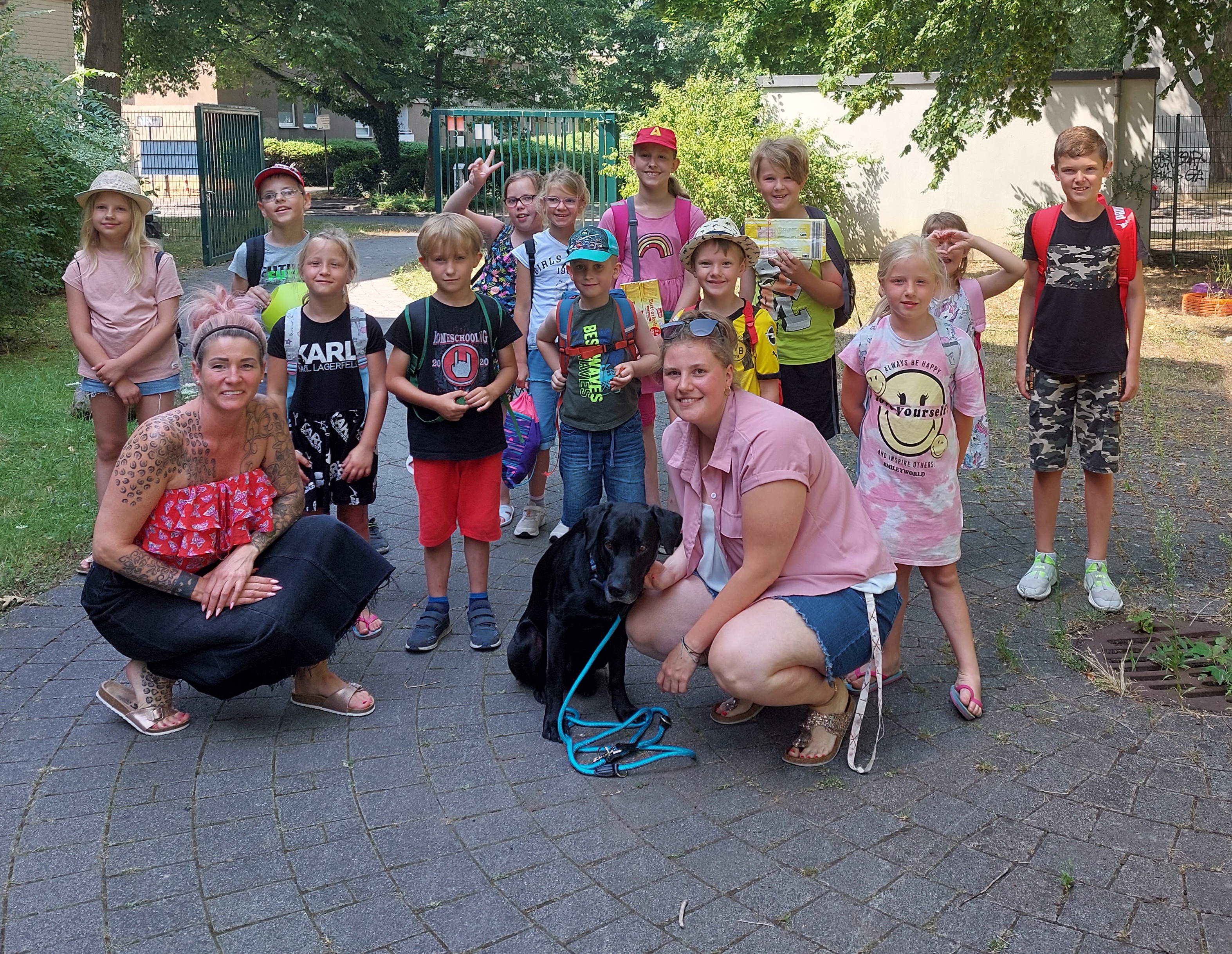 Auf dem Abenteuerspielplatz gab es bei den hohen Temperaturen eine Abkühlung im Wasserbecken. Auch Bagheera der Schulhund war zu Besuch und die Kinder lernten, sich einem Tier gegenüber richtig zu verhalten.